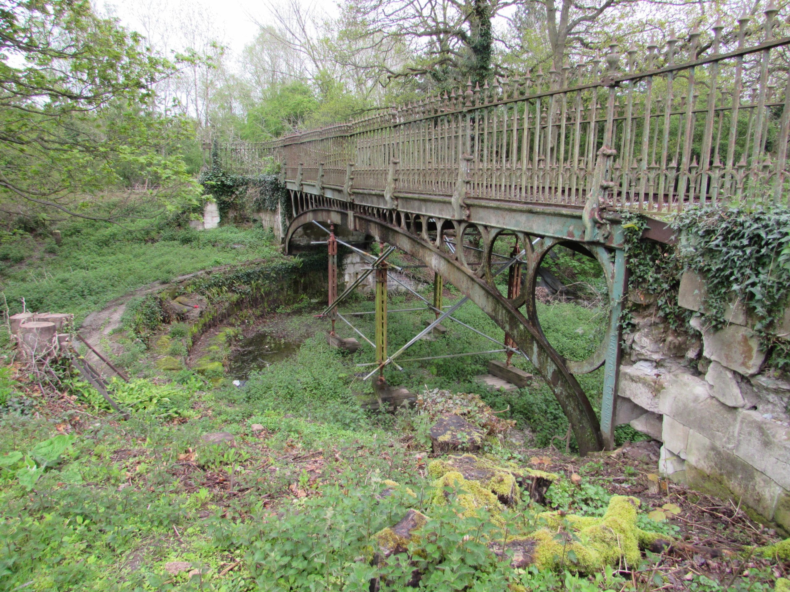 A report on the bridge in November 2020 noted ‘a combination of water erosion from overspill of Brockhill Weir and invasive tree root action at the west abutment have resulted in a destabilised arch. Relative displacement at the west abutment in three-axes have allowed the northern arch to spring. Consequently, the bridge deck now lists towards the failed northern arch, the cast “crown-tie” at the crown of the arch has failed, along with the north parapet railings where the horizontal chords of the parapet have buckled in compression along with individual vertical balusters shearing in tension’.