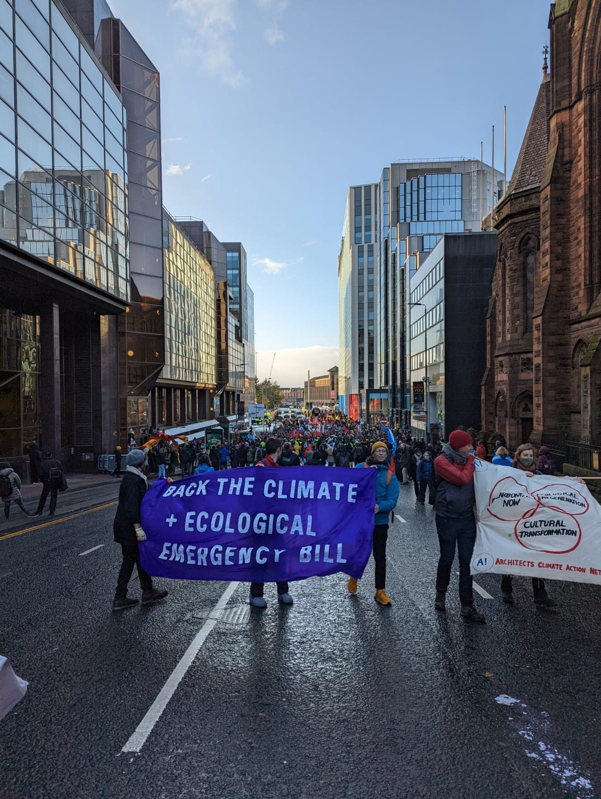 While the key discussions were taking place inside the highly secured SEC Campus, the public took to the streets expressing concern on the lack of actions from government. I also took part in the ‘Global Day of Action for Climate Justice’ march organised by the COP26 Coalition group, marching under the banner of Architects Climate Action Network (UK level) and New Glasgow Society (City level) with fellow architects from all over the UK. We met, we shared, and we got inspired by what everyone is doing regionally. These initiatives have been going on for years, and many have been campaigning relentlessly about built environment topics such as building retrofit, circular economy and the use of natural materials in the construction industry.