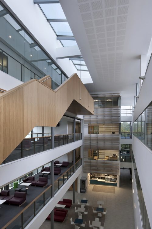 The building has also become an extremely popular events and conference venue with year one revenue rising to £20m against an investment value of just £21m. The award winning building was delivered ahead of programme and under budget at just £1600/sqm. The design comprises accommodation set either side of an atrium space which runs the length of the building. A three storey wing houses the main entrance, administration area, the hospitality suite and has staff workspaces at upper floors. On the opposite side of the atrium, a four storey wing houses the majority of the teaching spaces. The atrium will provide the social heart of the building. A feature staircase rises in a continuous line from ground to third floor and bridges at each level connect the two sides of the building. A 200 seat lecture theatre cantilevers over the main entrance below, positioned on the main axis of approach through the campus and provides a dramatic visual stop-end to this key vista.