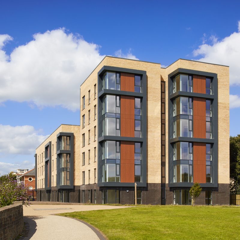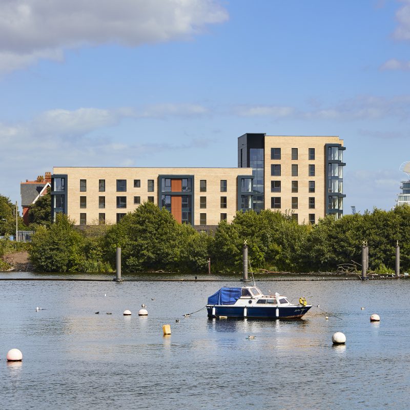 The apartment building is orientated north/south and faces directly on to the river and Taff Trail cycle route. A six storey element punctuates the southwest corner and acts as a landmark when viewed from Cardiff Bay against the backdrop of Cardiff City Centre.