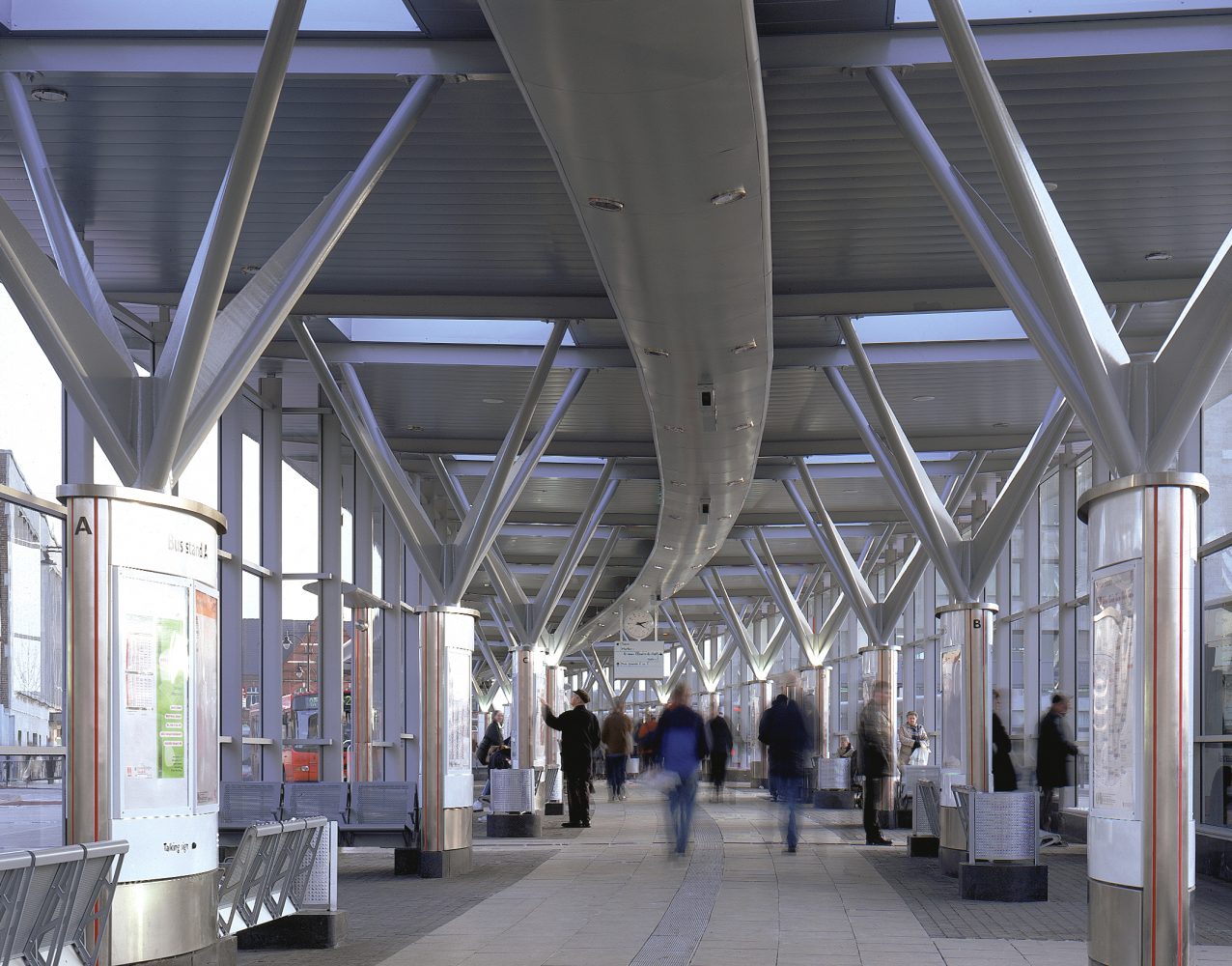 WIGAN TRANSPORT HUBThe underside of the striking form of the concourse roof is clad in anodized aluminium sheeting, creating a strong focal point over the key entrance area -