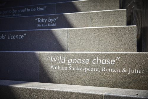 Located within the Conservation Area, at the heart of the town centre in Prescot, it celebrates a unique late sixteenth century theatre that once stood in the town, and theatre patronage by the Earls of Derby of Knowsley Hall during Shakespeare’s lifetime, in particular by Lord Strange.