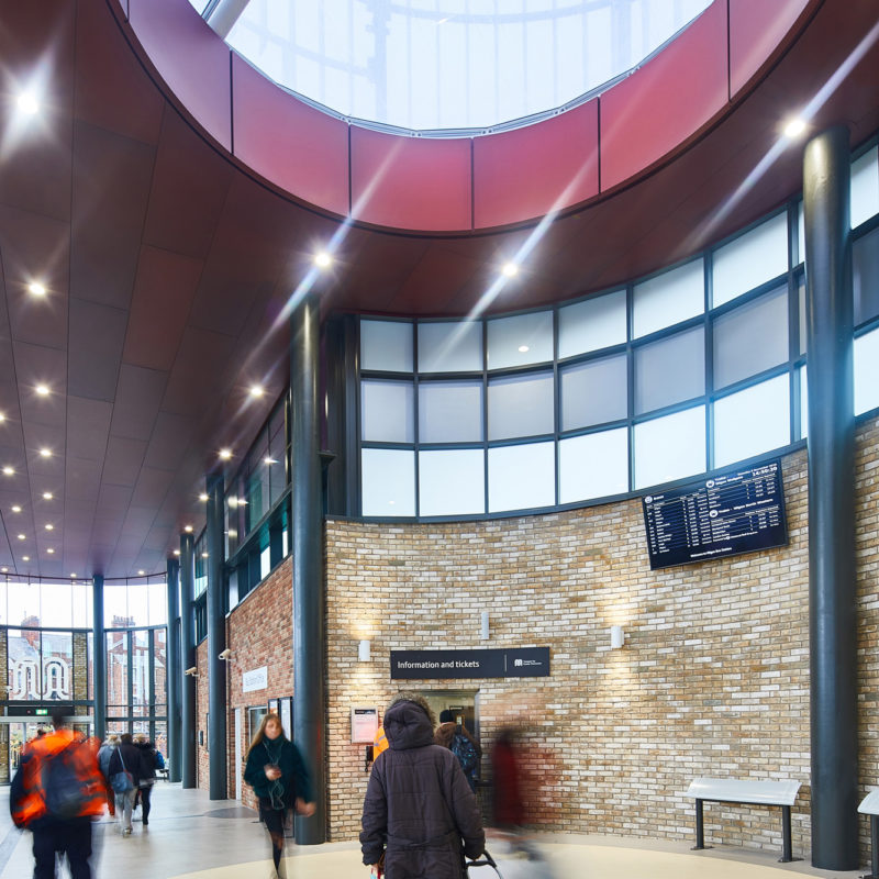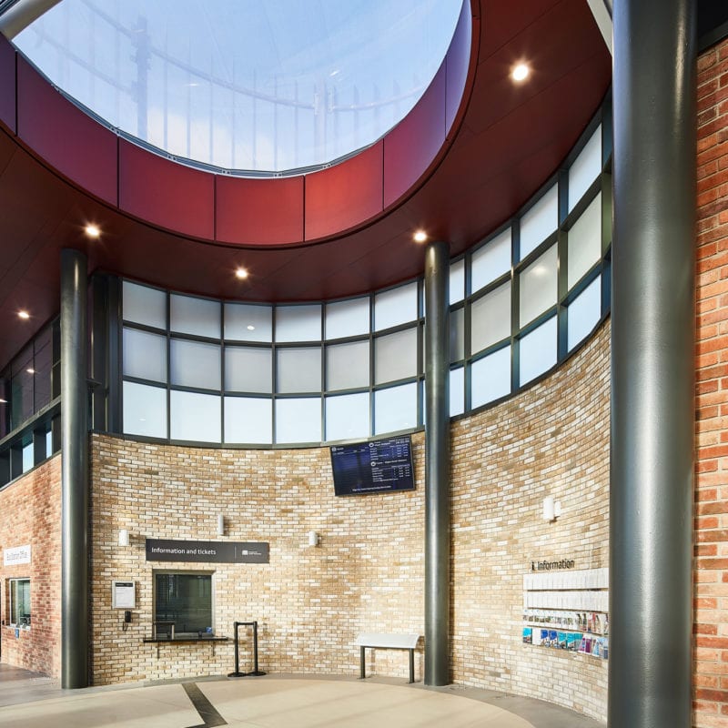 WIGAN TRANSPORT HUBThe underside of the striking form of the concourse roof is clad in anodized aluminium sheeting, creating a strong focal point over the key entrance area -