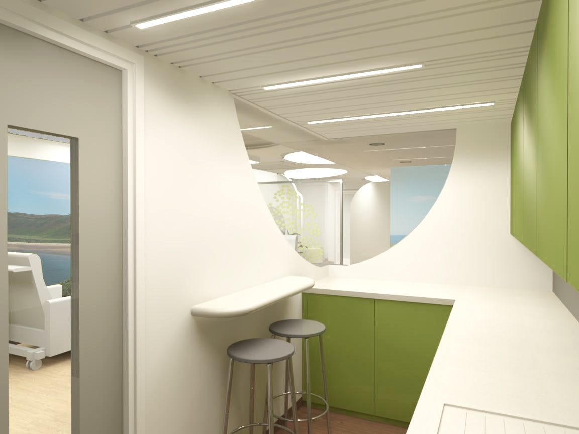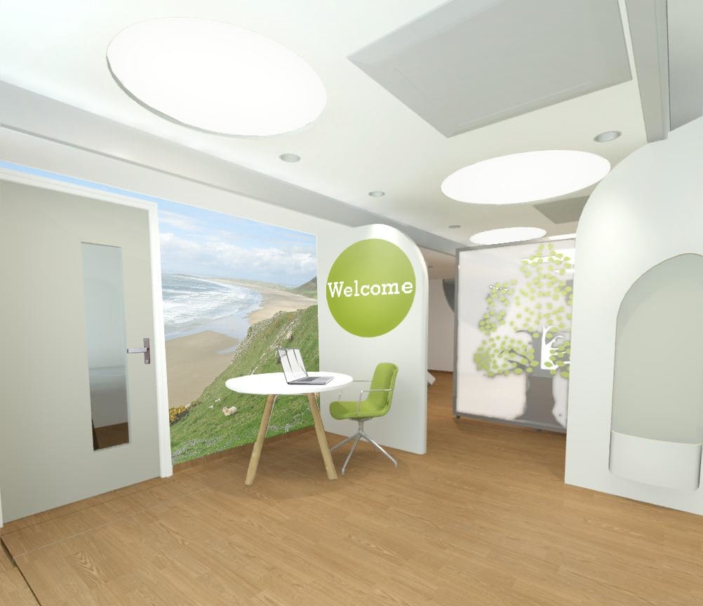 The colour scheme for the unit we developed is focused around landscape images that are an integral part of the existing units and extremely popular with patients and staff. By using images of welsh landscapes, we are able to bring Biophillic elements into the space to allow visitors to benefit from it. The 2014 Terrapin Bright Green report highlighted the 14 patterns of biophillic design and how these can be used to “reduce stress, enhance creativity and clarity of thought, improve our wellbeing and expedite healing”. The layout and finishes aim to take visitors on a journey from the earthy tones in the reception, through to the openness of beachy landscapes in the main treatment area.